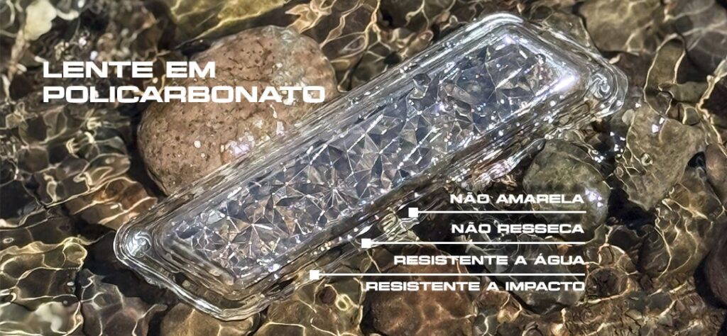 Sua lente em policarbonato garante resistência a impactos, não amarela e não resseca, enquanto a base em ABS ultra-resistente assegura durabilidade e estabilidade mesmo sob altas temperaturas.